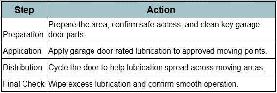 A technician follows a structured process, so lubrication supports smooth door travel without creating buildup. For safety, the technician starts with controlled preparation and completes inspection and checking before applying lubrication.