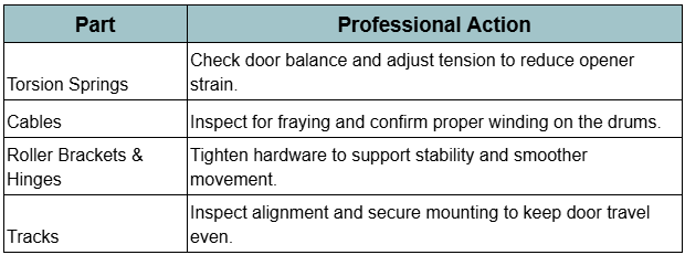During the appointment, the technician inspects key garage door parts, makes minor adjustments where needed, and applies the correct lubricant to approved moving points. This helps reduce friction, ensures smooth door movement, and highlights early wear before it becomes a bigger issue.
